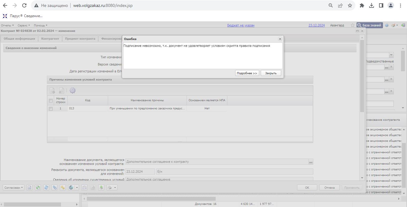после заполнения полей по изменению в основной договор на основании дополнительного соглашения и прикрепления скана доп. соглашения при выборе пункта ("Подписать и отправить сведения в ЕИС") выдает ошибку Подписание невозможно, т.к. документ не удовлетворяет условиям скрипта правила подписания.