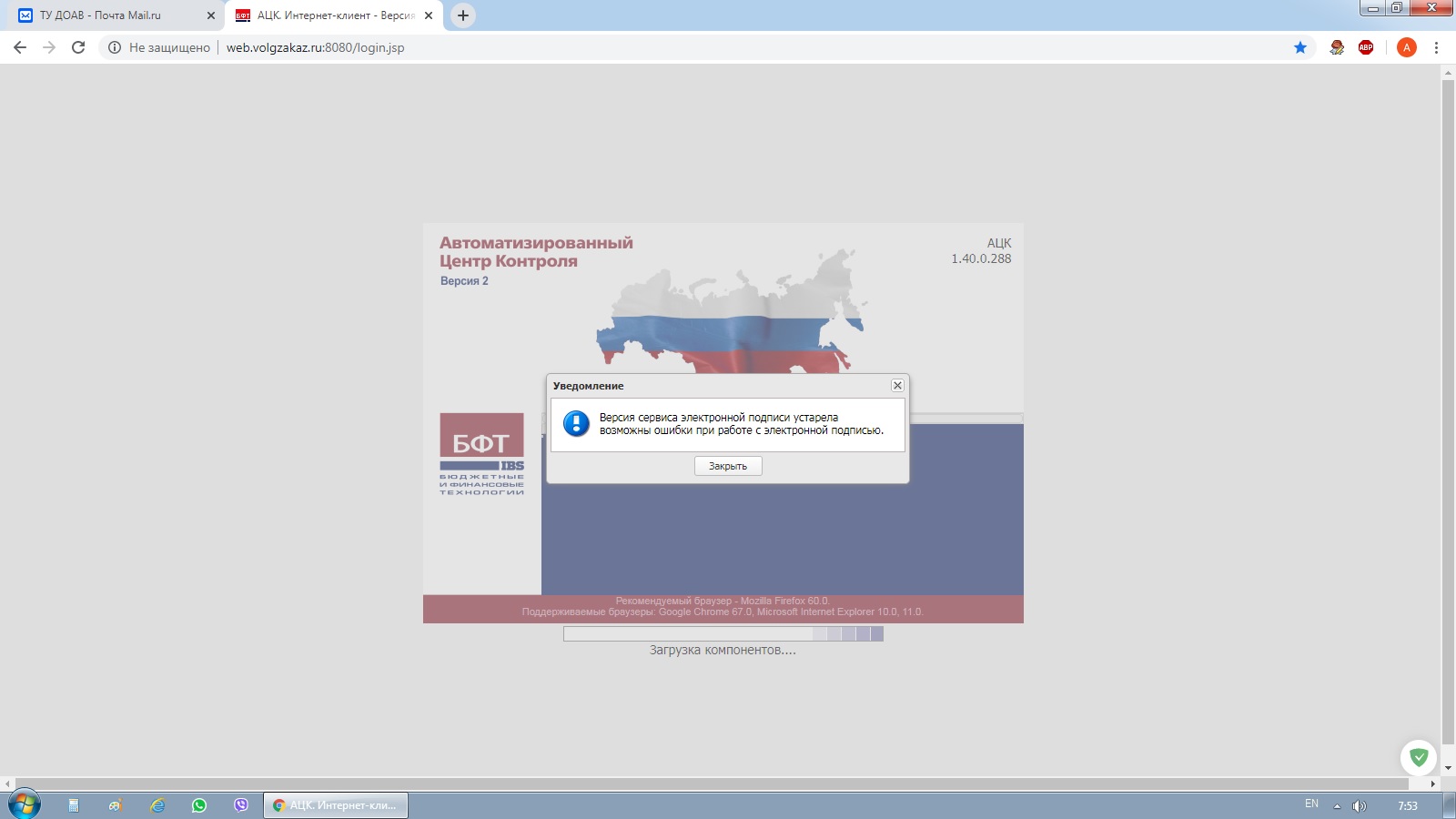 возможны ошибки при работе с электронной подписью." При нажатии на кнопку "Закрыть" АЦК не загружается, не удается осуществить вход.
