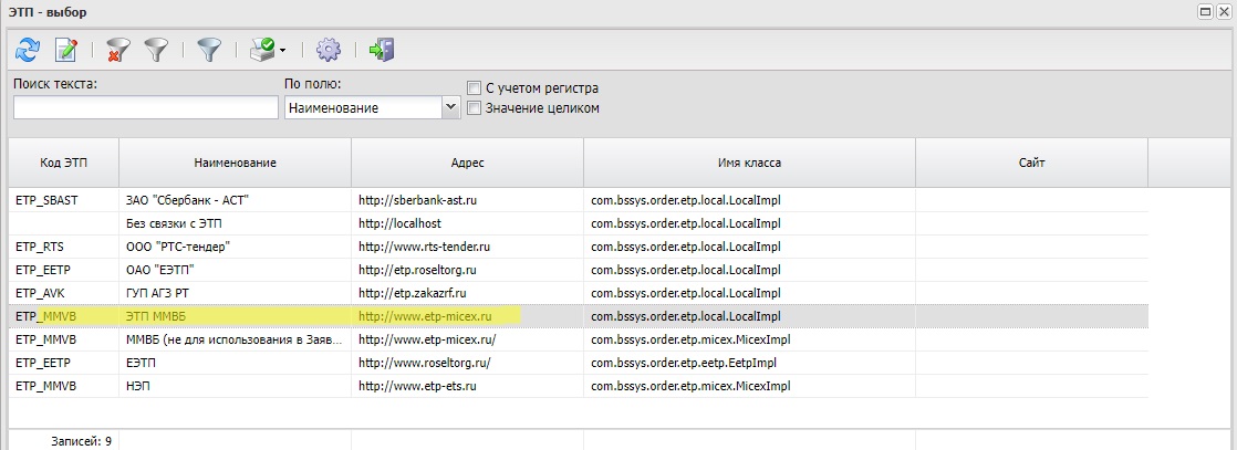 В справочнике при формировании заявки на закупку отсутствует электронная торговая площадка www.etp-ets.ru