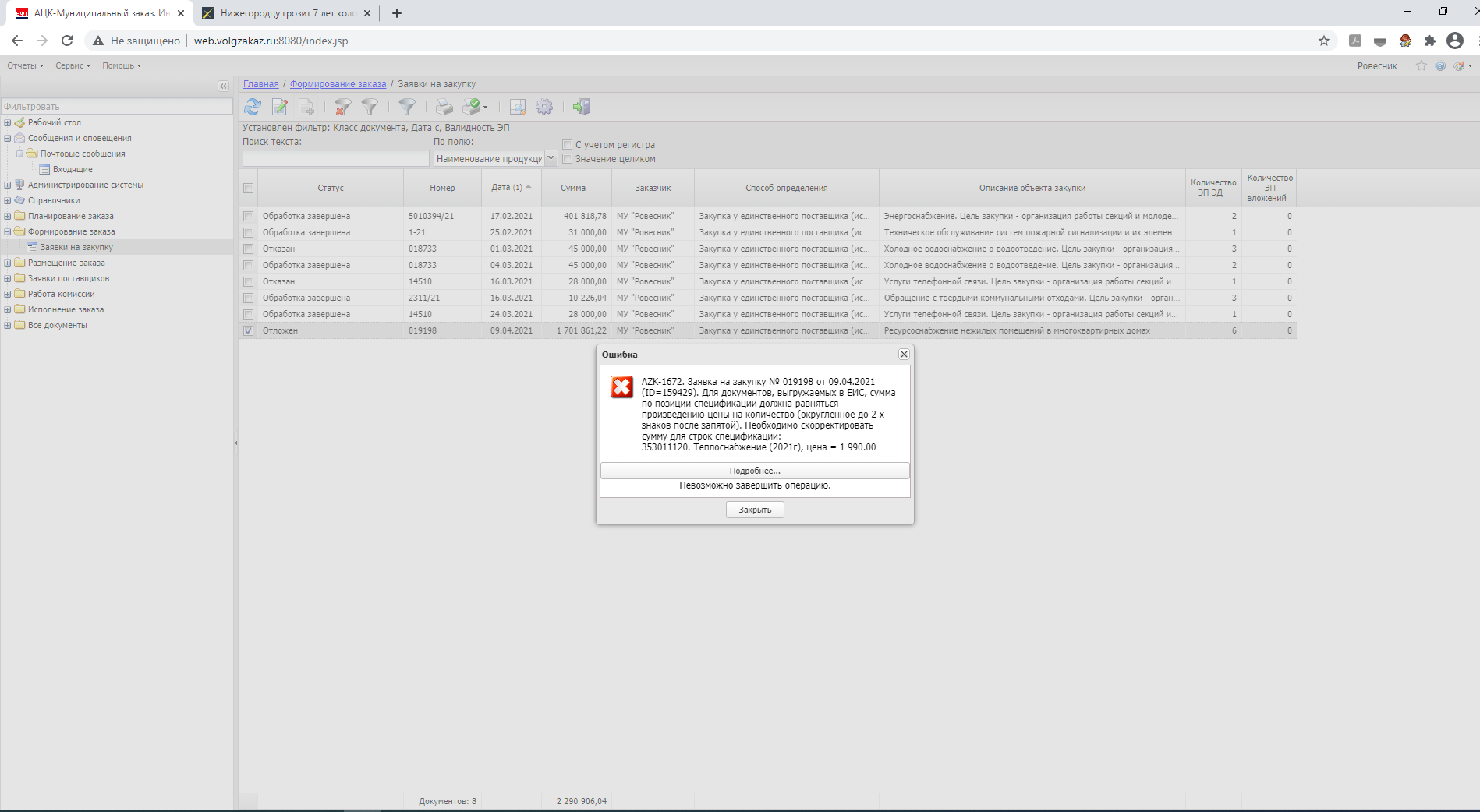 При отправке заявки на закупку № 019198 от 1 701 861,22 руб. на отработку возникает ошибка (см. скрин). Для документов, выгружаемых в ЕИС, сумма по позиции спецификации должна равняться произведению цены на количество (округленное до 2-х знаков после запятой).