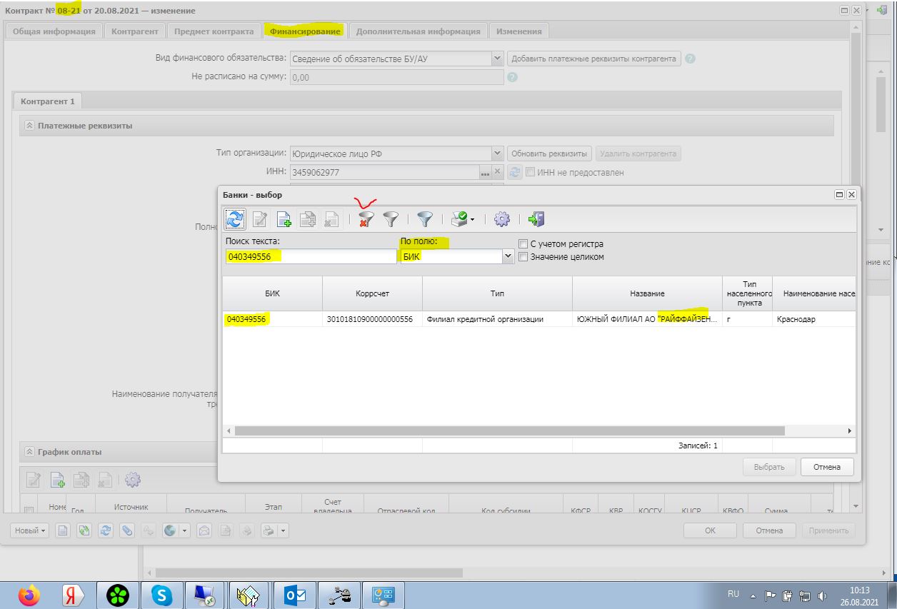 В ЭД "Контракт" (08-21) на вкладке "Финансирование" невозможно внести БИК (040349556). Через "..." не находит банк