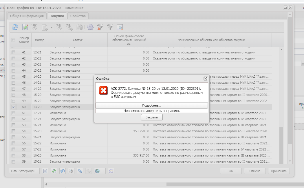 Добрый день! При формировании заявки на закупку через план график в малых закупках выдает ошибку,Подскажите пожалуйста причину.