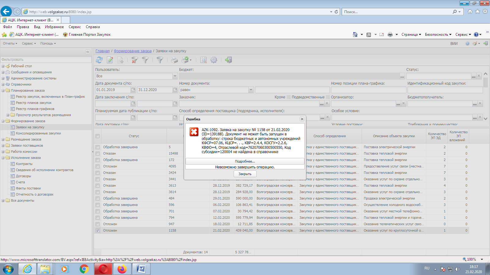 Невозможно завершить операцию при обработке заявки на закупку №1158 от 21.02.2020 г.