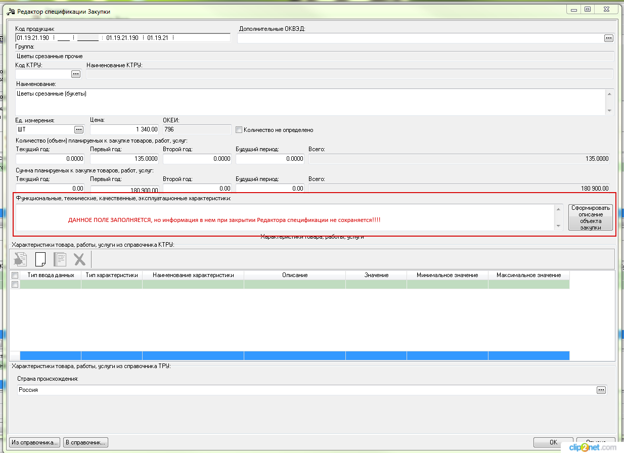 На первой вкладке ЭД «Объект закупки», далее «Спецификация», далее «Редактор спецификации Закупки» в нем появилось поле «Функциональные, технические, качественные, эксплуатационные характеристики:», (соответствующее ЕИС). Данное поле доступно для редактирования, но информация введенная в него при закрытии Редактора спецификации не сохраняется, не нажатием кнопки «Применить», также не помогает перевод закупки на статус «Согласование». Просим срочно принять меры к исправлению ситуации!!!