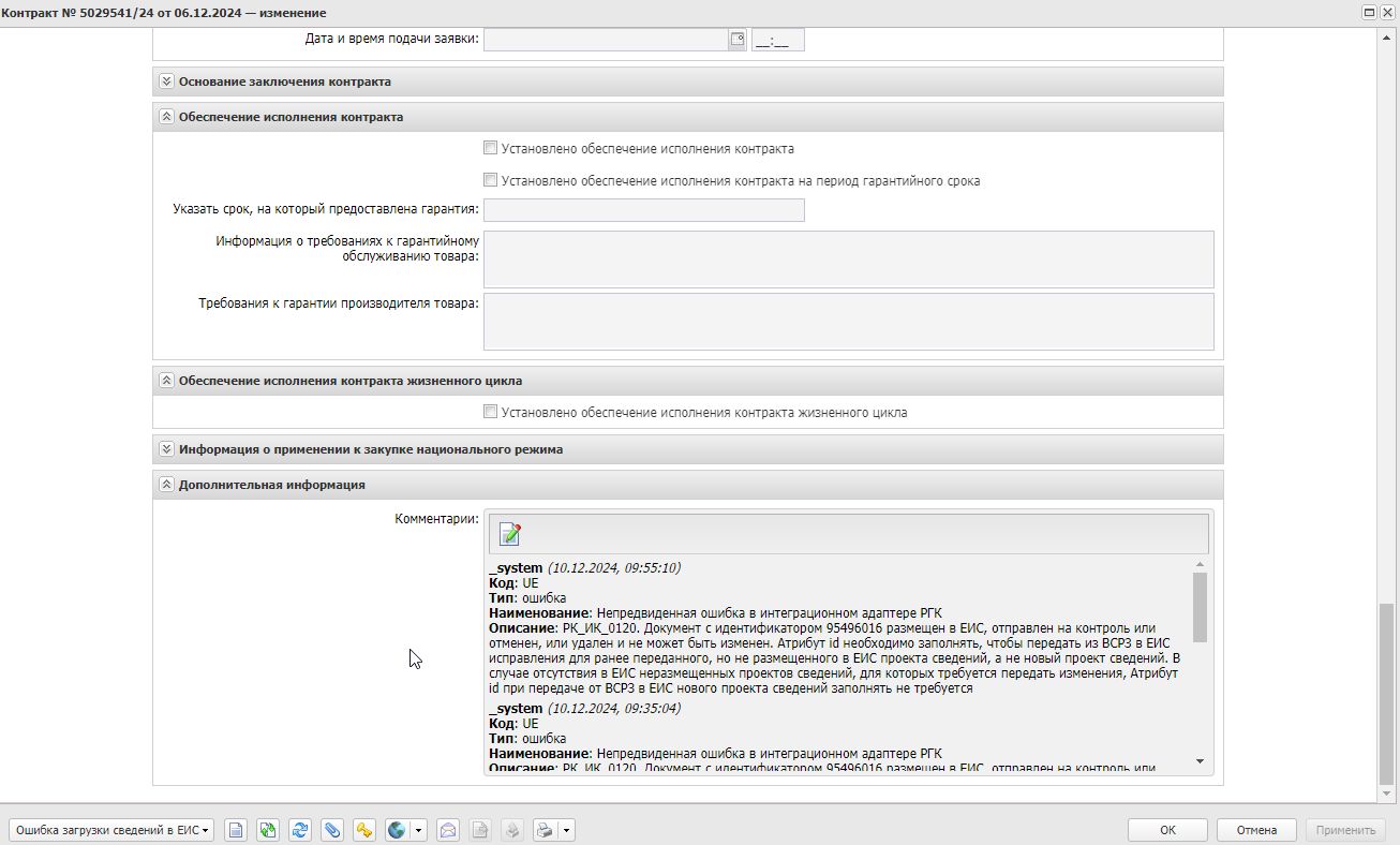 При повторной выгрузке контракта № 5029541/24 происходит ошибка: "РК_ИК_0120. Документ с идентификатором 95496016 размещен в ЕИС, отправлен на контроль или отменен, или удален и не может быть изменен. Атрибут id необходимо заполнять, чтобы передать из ВСРЗ в ЕИС исправления для ранее переданного, но не размещенного в ЕИС проекта сведений, а не новый проект сведений. В случае отсутствия в ЕИС неразмещенных проектов сведений, для которых требуется передать изменения, Атрибут id при передаче от ВСРЗ в ЕИС нового проекта сведений заполнять не требуется". Ошибка возникла ввиду удаления измененной версии контракта из ЕИС.
