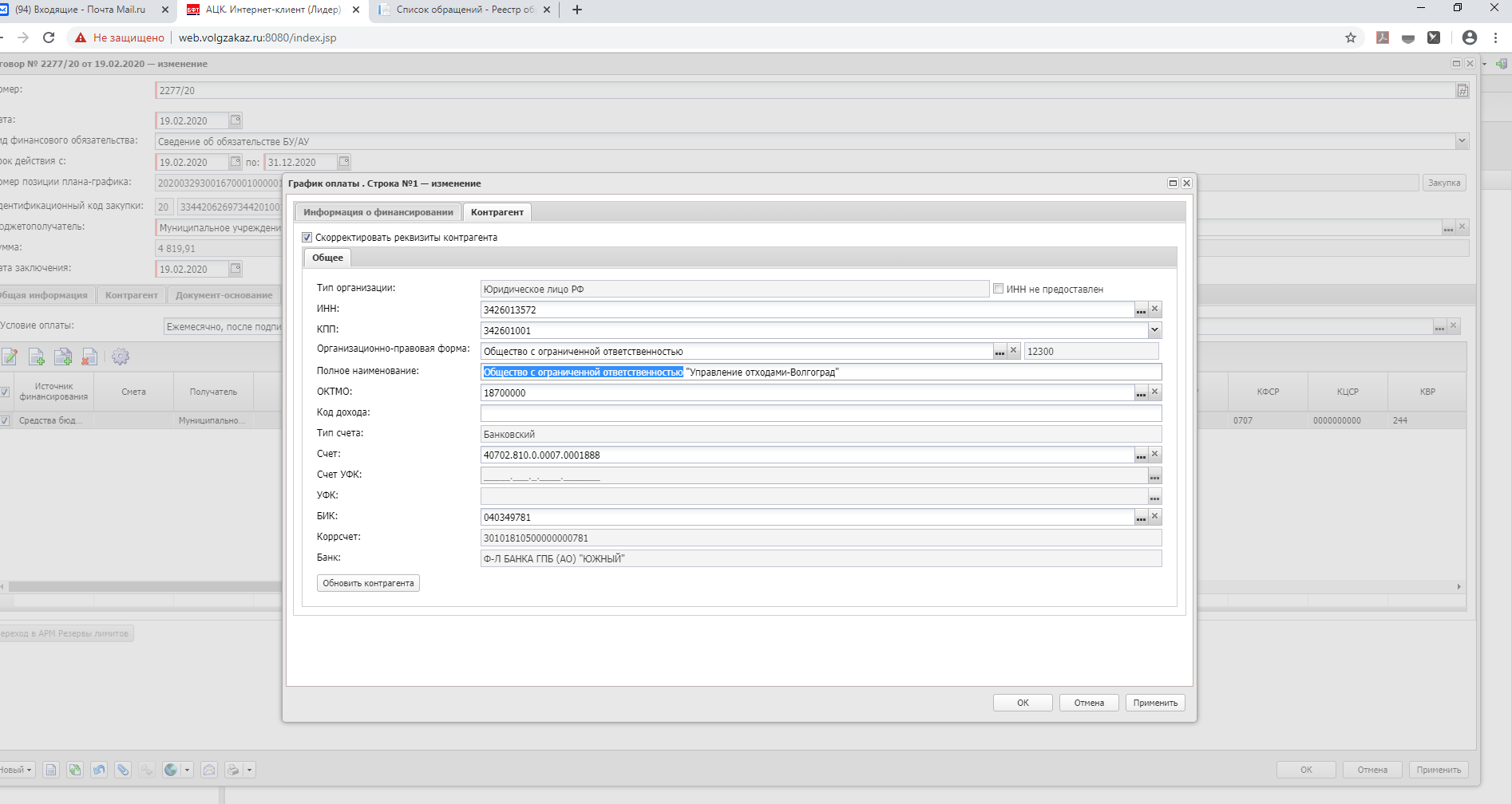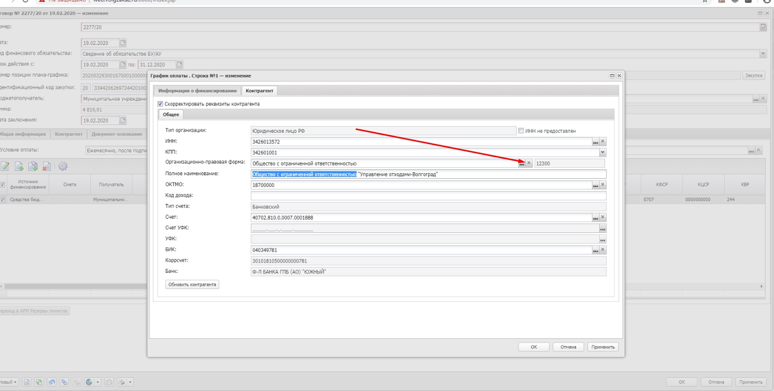 Депфин отказал договор, т.к. в графике оплаты присутствует дублирование ОПФ (организационно-правовой формы) Исполнителя. Но если убрать из наименования Исполнителя ОПФ, Мунзак автоматически убирает р/счет Исполнителя, если добавить р/с, мунзак автоматически возвращает ОПФ в наименование Исполнителя. Как убрать ОПФ - Общество с ограниченной ответственностью - из наименования организации?