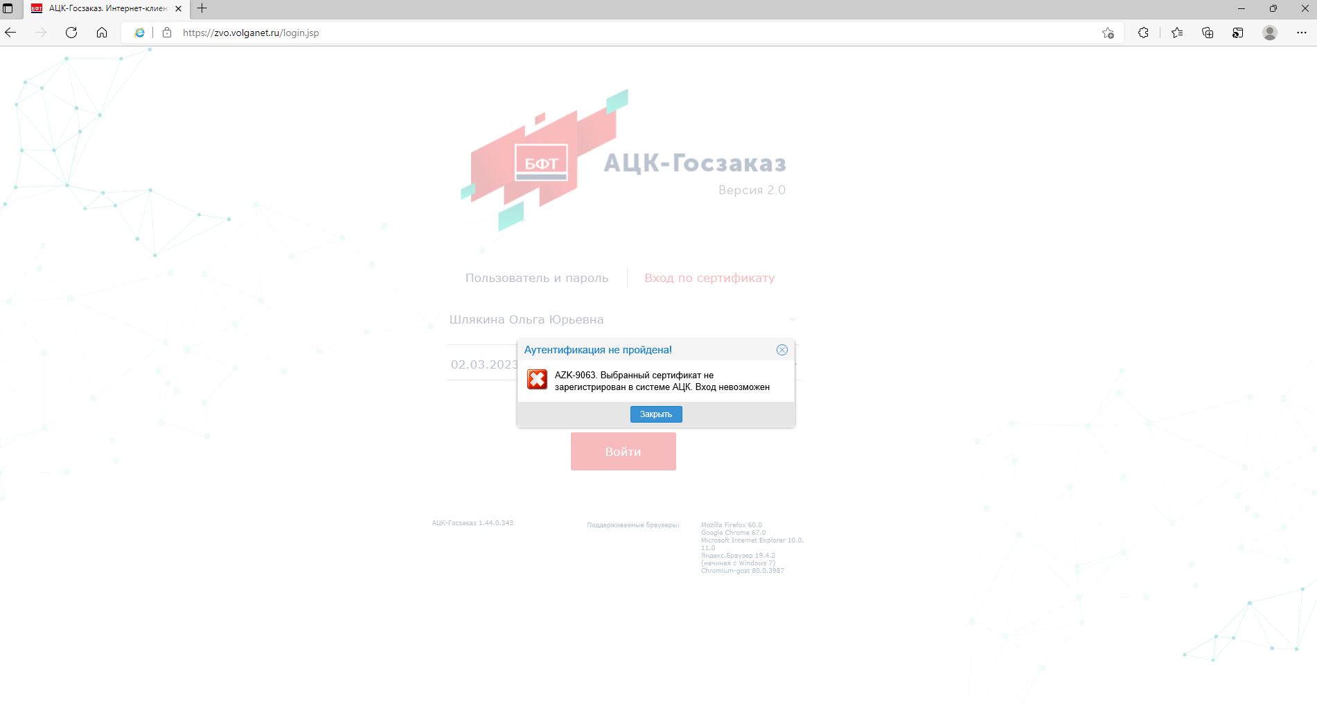 Ошибка аутентификации при попытке входа в клиент АЦК-Муниципальный заказ. В ошибке указано, что выбранный сертификат не зарегистрирован в системе АЦК, однако ранее со входом проблем не возникало и сертификат предварительно был зарегистрирован.