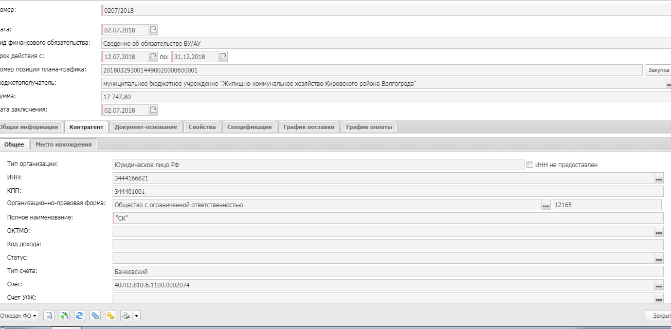 Уберите галочку на закладке График оплаты - в развернутой строке источник финансирования (График оплаты. Строка №1 просмотр) есть ещё одна закладка Контрагент, снимите там галочку скорректировать реквизиты контрагента.