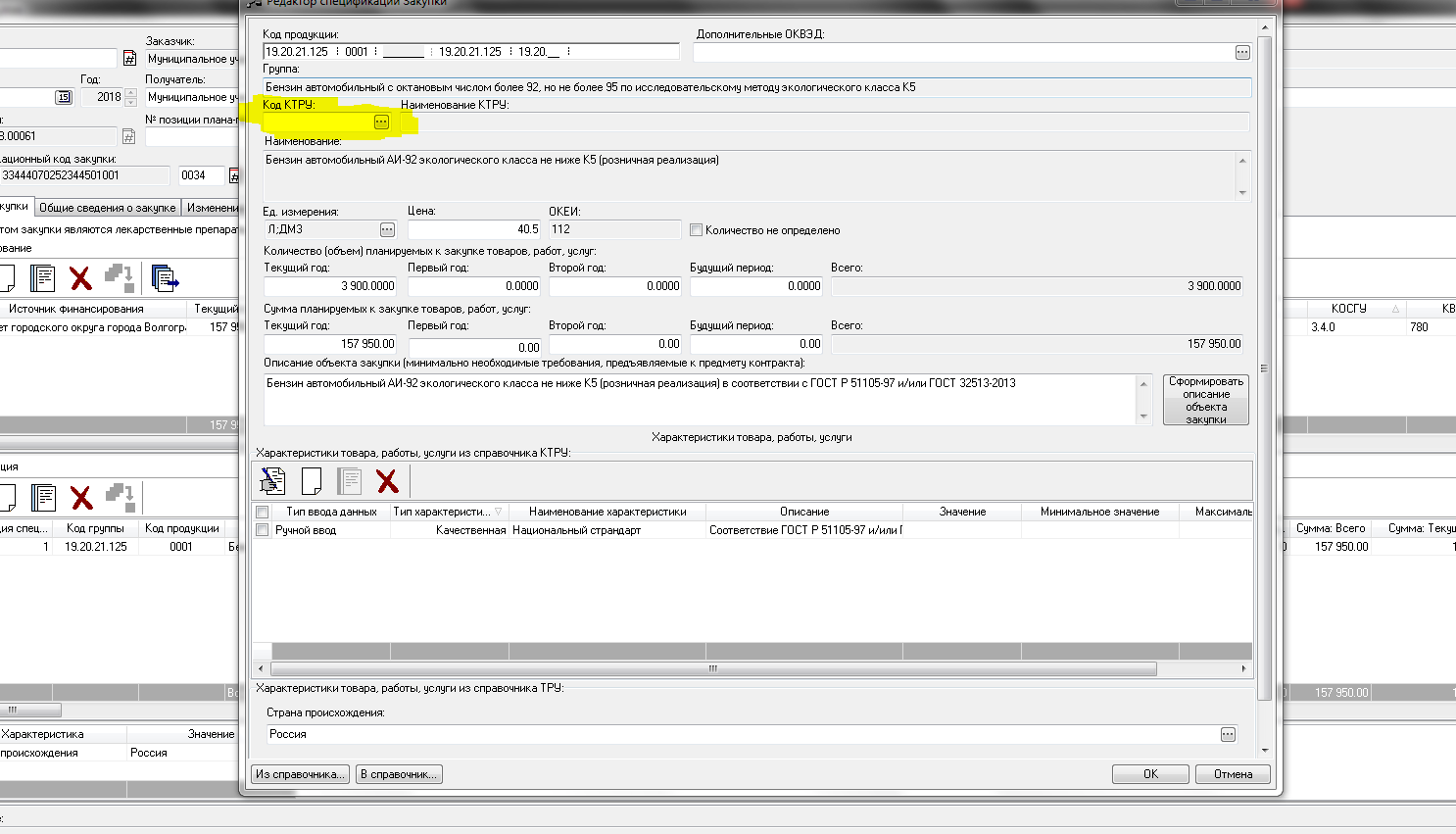 В спецификации закупки в ПЗ необходимо добавить характеристику товара, работы, услуги из справочника КТРУ (!!!), однако данная кнопки неактивна.