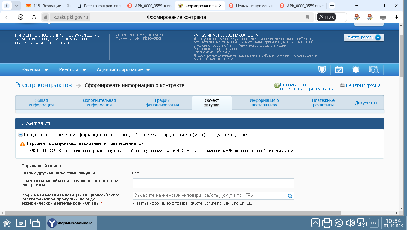 В контракте НДС только по одной позиции. В вкладке "Объект закупки" прописана только одна позиция с НДС, а остальные позиции без НДС.