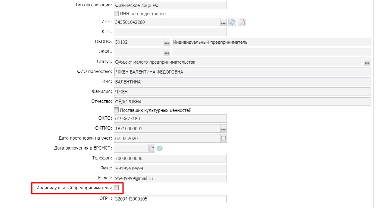 Контракт по МОУ СШ 93 с № 93-К от 05.04.2021г. при выгрузке сведений в ЕИС, возникает ошибка: APK_0000_0613. Для поставщика ЧЖЕН ВАЛЕНТИНА ФЁДОРОВНА по выбранной закупке должен быть установлен признак «Индивидуальный предприниматель». Хотя признак стоит. Перевыбирали. Не выгружает. Просим оказать помощь.Спасибо.