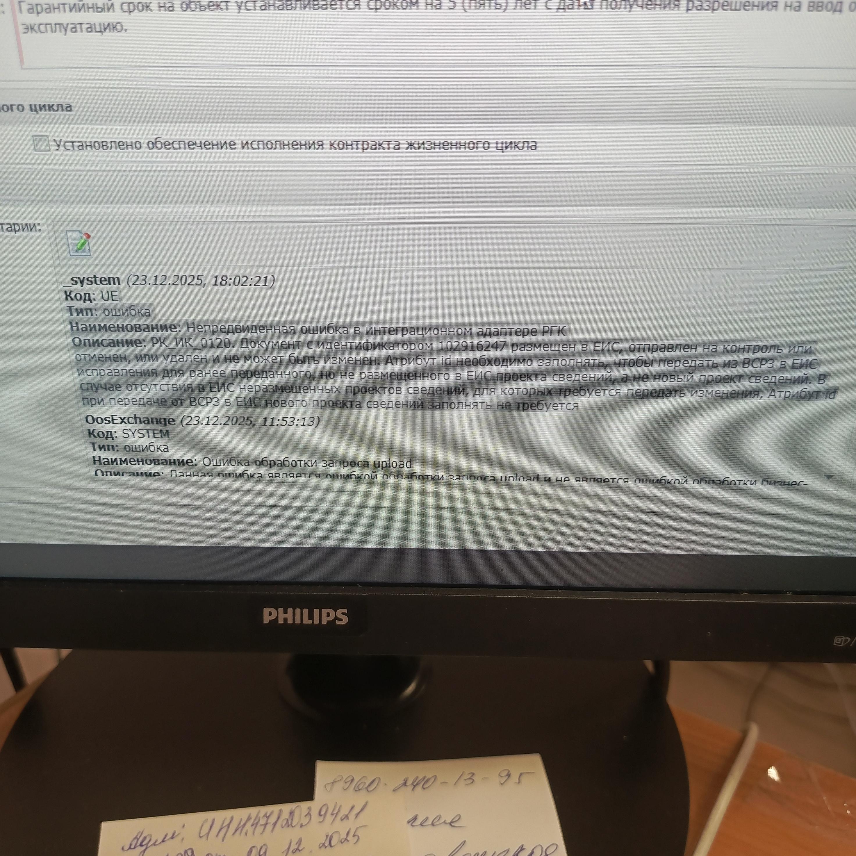 Документ с идентификатором 102916247 размещен в ЕИС, отправлен на контроль или отменен, или удален и не может быть изменен. Атрибут id необходимо заполнять, чтобы передать из ВСРЗ в ЕИС исправления для ранее переданного, но не размещенного в ЕИС проекта сведений, а не новый проект сведений. В случае отсутствия в ЕИС неразмещенных проектов сведений, для которых требуется передать изменения, Атрибут id при передаче от ВСРЗ в ЕИС нового проекта сведений заполнять не требуется".