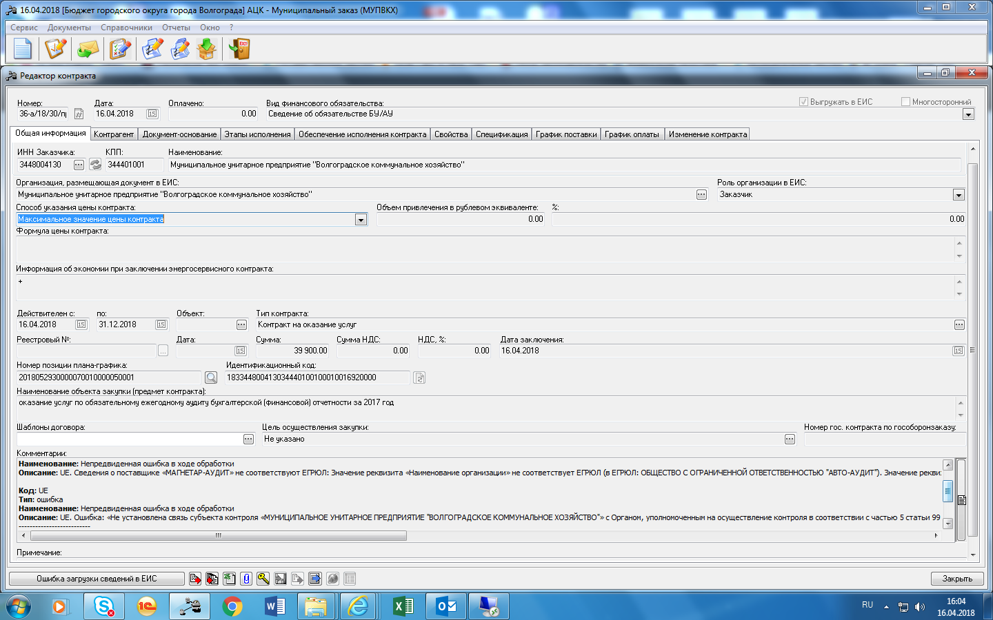 Описание: UE. Ошибка: «Не установлена связь субъекта контроля «МУНИЦИПАЛЬНОЕ УНИТАРНОЕ ПРЕДПРИЯТИЕ "ВОЛГОГРАДСКОЕ КОММУНАЛЬНОЕ ХОЗЯЙСТВО"» с Органом, уполномоченным на осуществление контроля в соответствии с частью 5 статьи 99 Федерального закона № 44-ФЗ, либо органом Федерального казначейства (финансовым органом субъекта РФ (муниципального образования)), осуществляющим проверку информации, включаемой в реестр контрактов, в соответствии с постановлением Правительства Российской Федерации от 28.11.2013 г. № 1084. Размещение информации невозможно»."