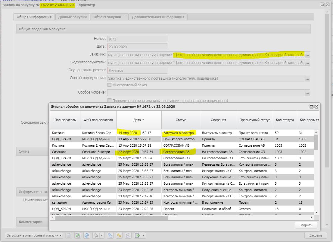 Здравствуйте! В системе АЦК направлена заявка на закупку 1672 от 23.03.2020 на сумму 61113,31. С 27.03.2020 данная заявка находится на статусе "Согласование АВ". Дополнительных комментариев в заявке нет. Можно ли узнать прогноз по согласованию данной заявки?
